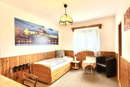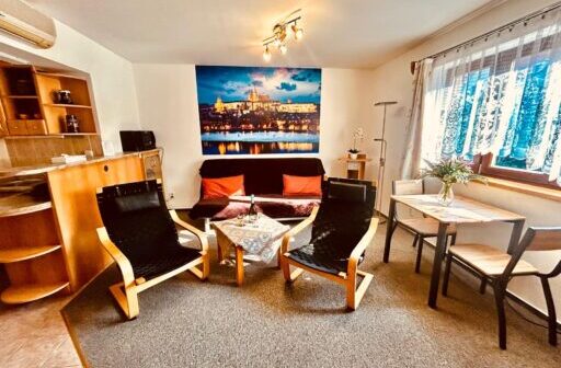 Apartmány mají 2 oddělené ložnice a společnou koupelnu ( vana nebo sprcha, wc ) V jednom z apartámů je k dispozici obývací pokoj a terasa s příjemným posezením a pěkným výhledem na Prahu.